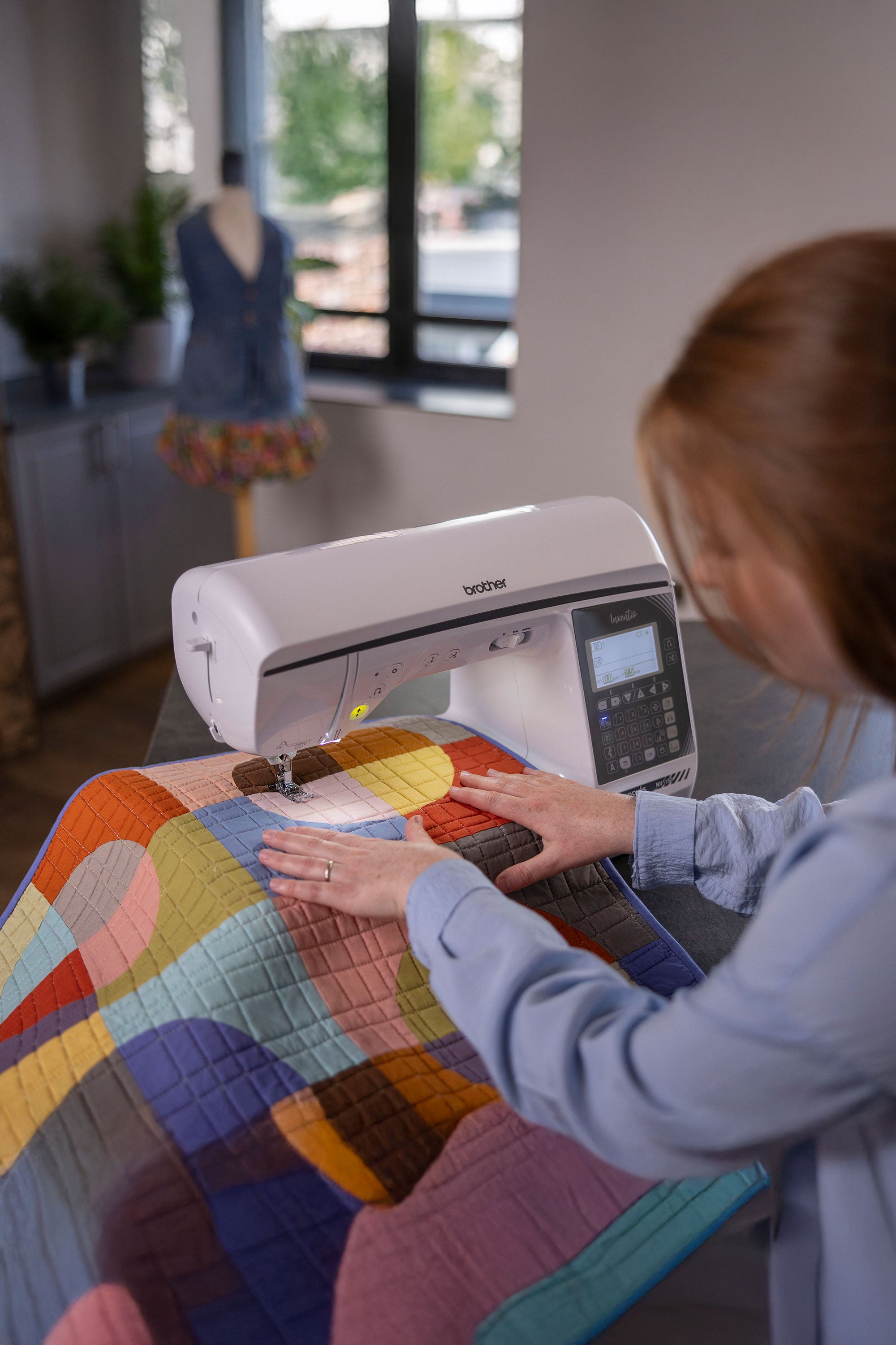 Ihr großer Arbeitsbereich von 210 mm rechts der Nadel bietet viel Raum zum Führen größerer Stoffe, ideal für Quilts, Kleidung und Heimtextilien. Das Square Feed Drive System (SFDS) gewährleistet einen gleichmäßigen Stofftransport – auch bei dicken Materialien oder Zierstichen.