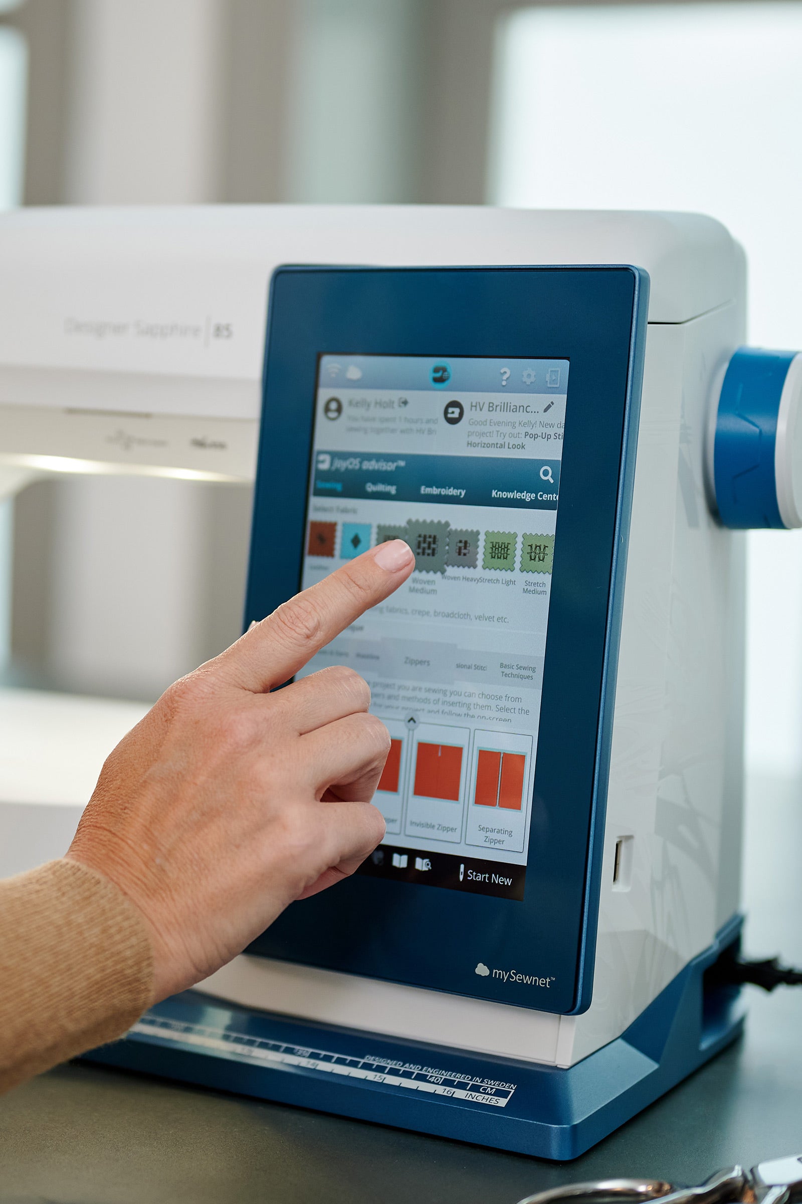 Von der Brilliance 80 inspiriert, aber Lichtjahre voraus: Die Husqvarna VIKING™ Sapphire 85. Sie ehrt ihr Erbe mit charakteristischen blauen Details, während sie die Grenzen dessen, was in Näh- und Stickkunst möglich ist, neu definiert. Ein paar Handgriffe genügen, um zwischen Nähen und Sticken zu wechseln, und mit der integrierten Schnellhilfe im Bildschirm bist du nie allein.