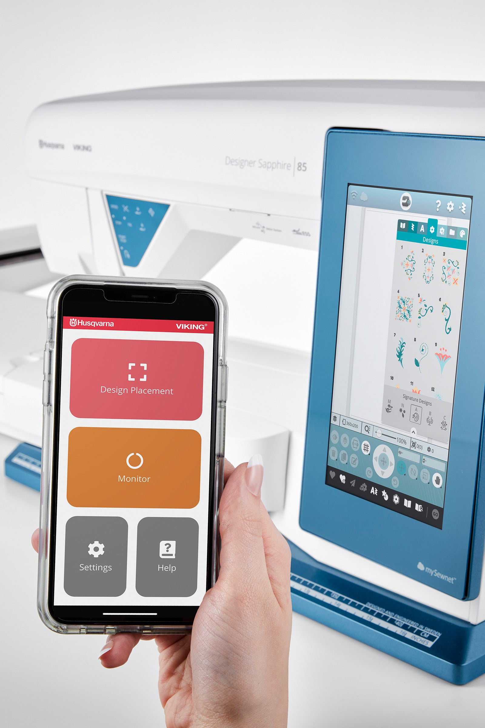 Avec la Husqvarna VIKING™ Sapphire 85, votre smartphone devient un véritable centre de commande créatif. Transférez facilement vos fichiers de broderie et suivez le processus de broderie en temps réel. Ainsi, vous gardez toujours un œil sur les changements de fil et vous consacrez à l'essentiel : du temps pour vous.